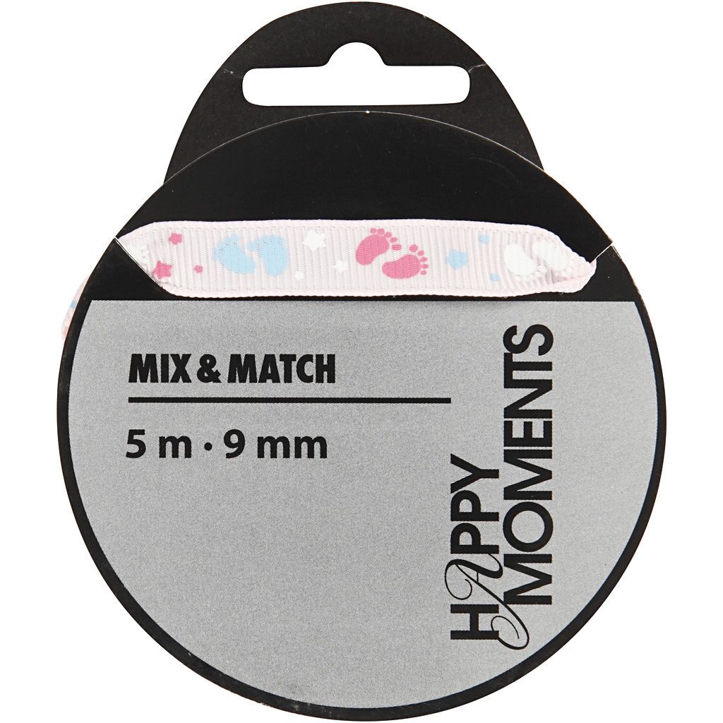 Grosgrainband i pastellfärger med små fotavtryck och stjärnor.