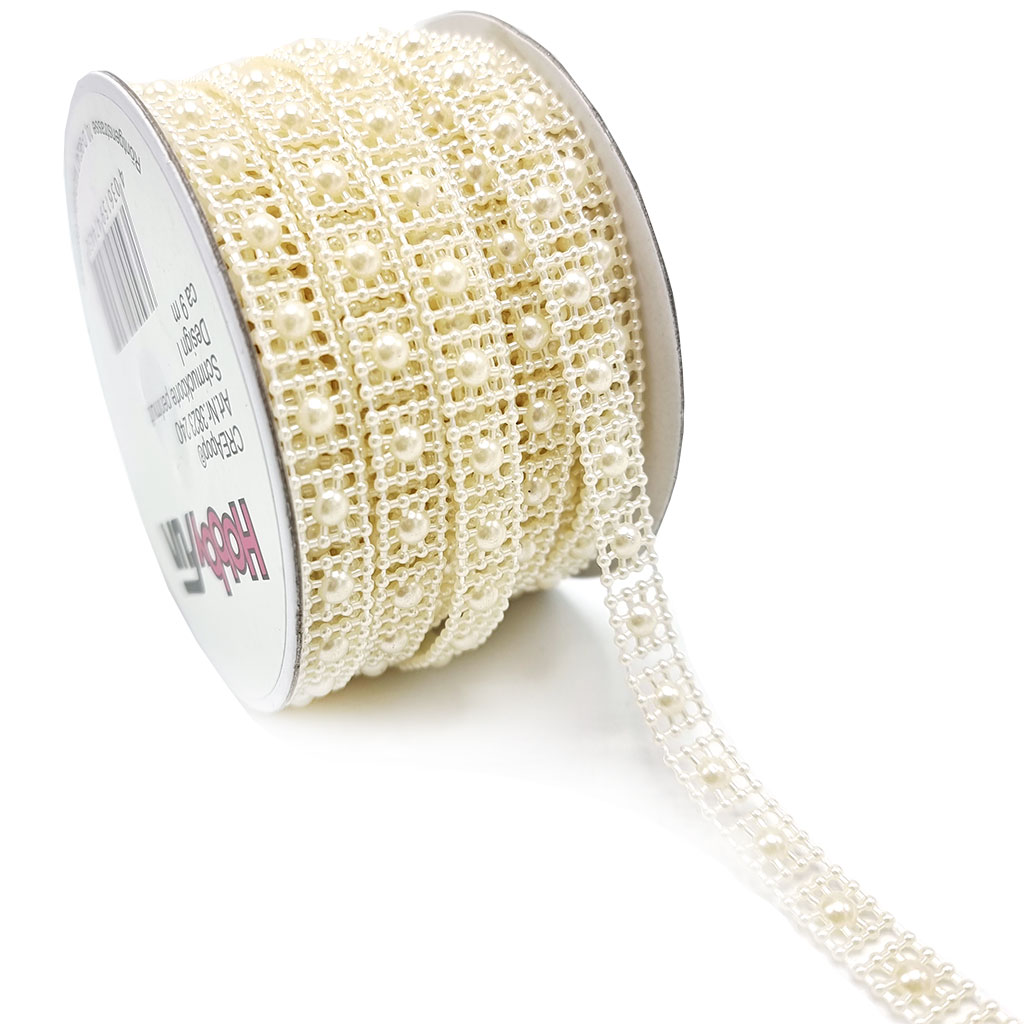 Elegant pärlband av mindre pärlor, dekorerad med större pärla i mitten. Perfekt till hobby, dekorationer, scrapbooking, blomsterarrangemang och kransar. Den platta baksidan gör det enkelt att limma fast på kort, album och kreativa projekt. Ett smidigt sätt att ge dina alster en stilfull och dekorativ pärlglans.
