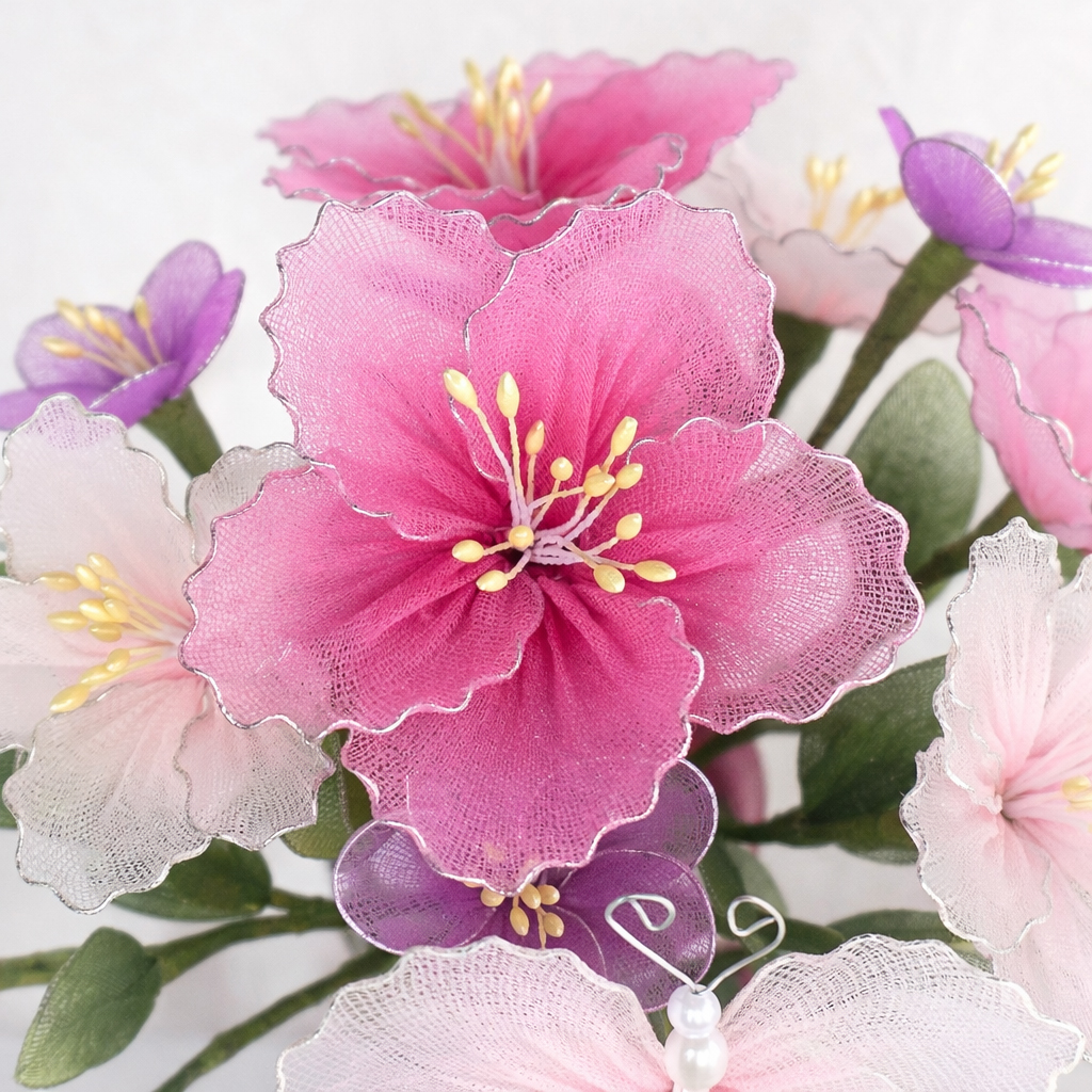 Nylontyg är mycket elastiskt och tunt. Nylon används främst till skapande av dekorativa blommor, fjärilar och trollsländor. Med hjälp av formbar ståltråd, böjer du önskad form som sedan kläs med nylon. Avsluta dina blommor med blomstertejp. Sätt gärna pistiller eller pärlor som en extra touch i din blomma.