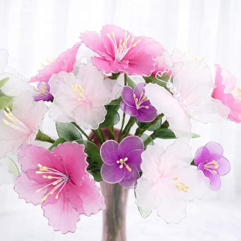 Nylontyg är mycket elastiskt och tunt. Nylon används främst till skapande av dekorativa blommor, fjärilar och trollsländor. Med hjälp av formbar ståltråd, böjer du önskad form som sedan kläs med nylon. Avsluta dina blommor med blomstertejp. Sätt gärna pistiller eller pärlor som en extra touch i din blomma.