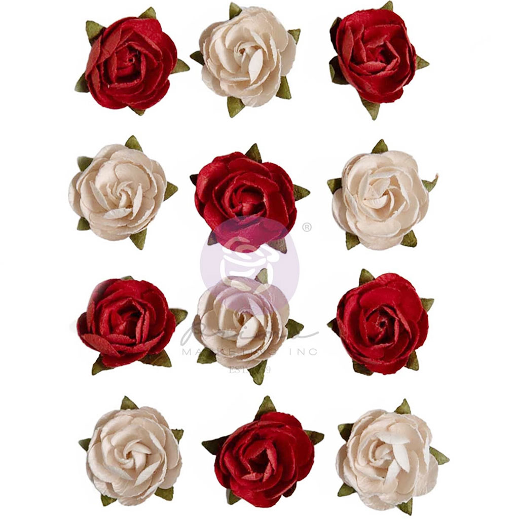 Dekorativa och detaljrika rosor i vitt och rött av mulberrypapper från Prima Marketing. Mycket välgjorda blommor för scrapbooking, korttillverkning, album och mixed media-projekt.