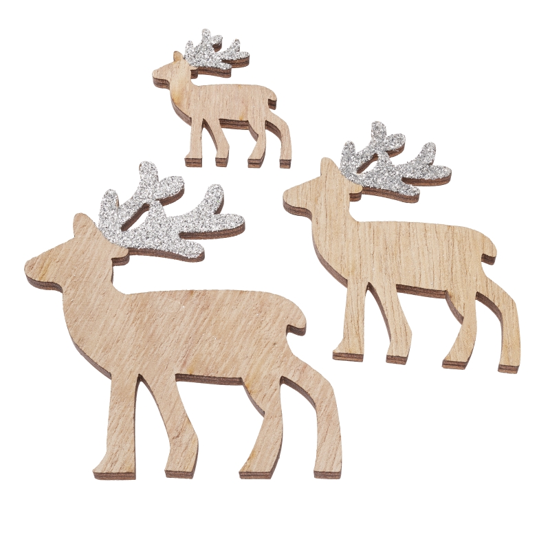 Vackra renar i trä, med silverglittriga horn. Perfekt till scrapbooking, julpyssel och hobby. Platt baksida som limmas fast med t.ex. limpistol eller distanskuddar.