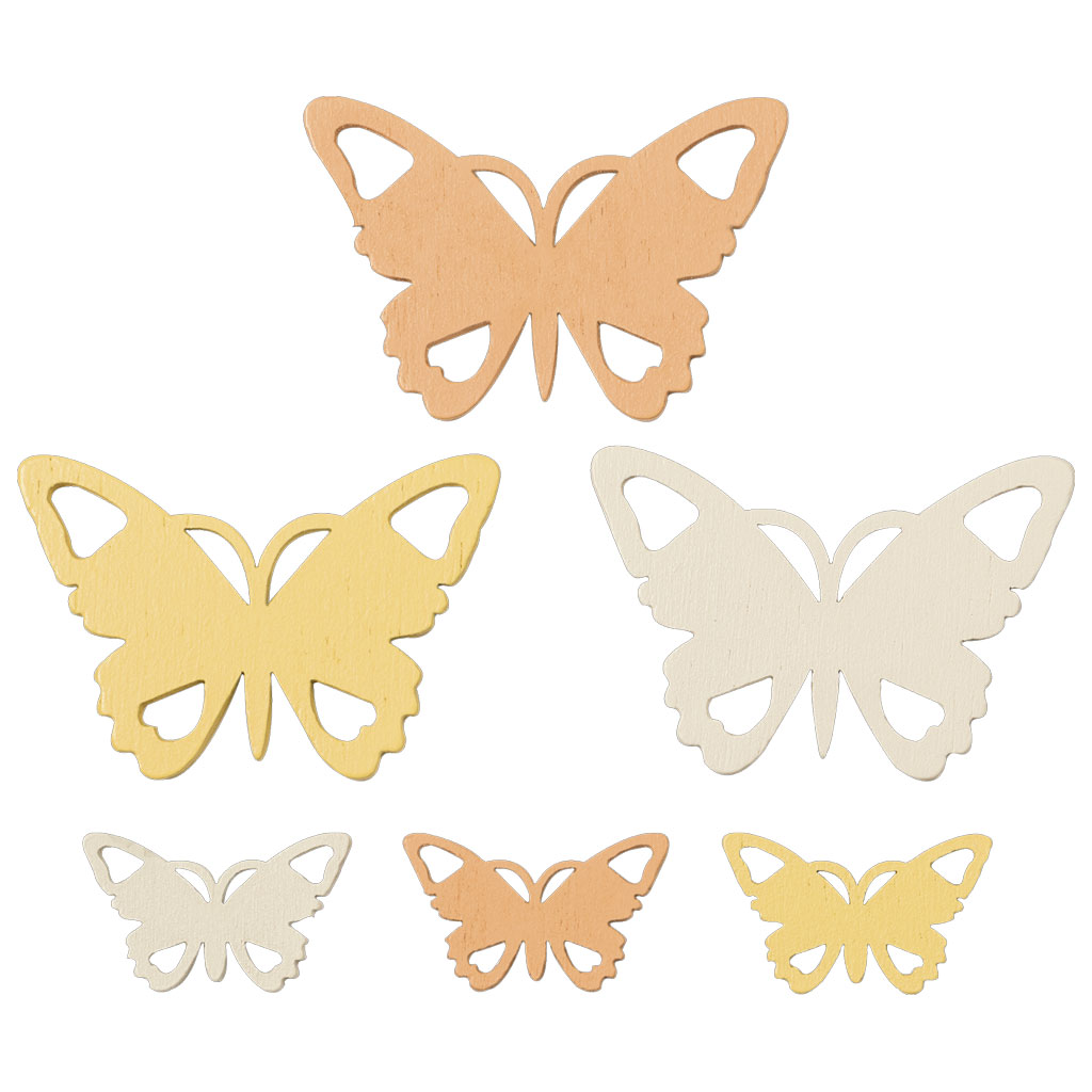 Trädekorationer i form av fjärilar, färgade i ljusgult, aprikos och beige. Levereras i box med två olika storlekar. Totalt 54 st stjärnor. Limmas fast på handgjorda kort, albumlayouter, presenter och gåvor m.m.