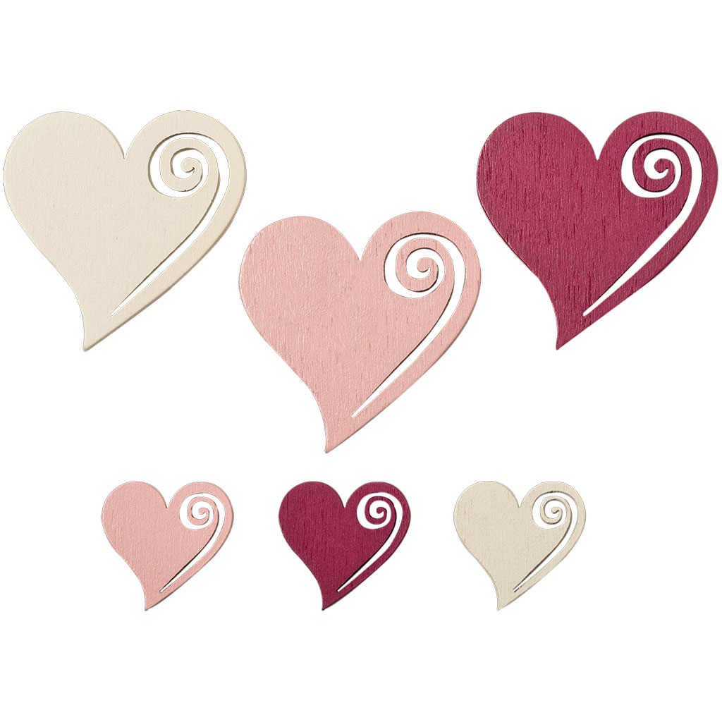 Trädekorationer i form av hjärtan, färgade i rött, rosa och creme. Levereras i box med två olika storlekar. Totalt 54 st hjärtan. Limmas fast på handgjorda kort, albumlayouter, presenter och gåvor m.m.