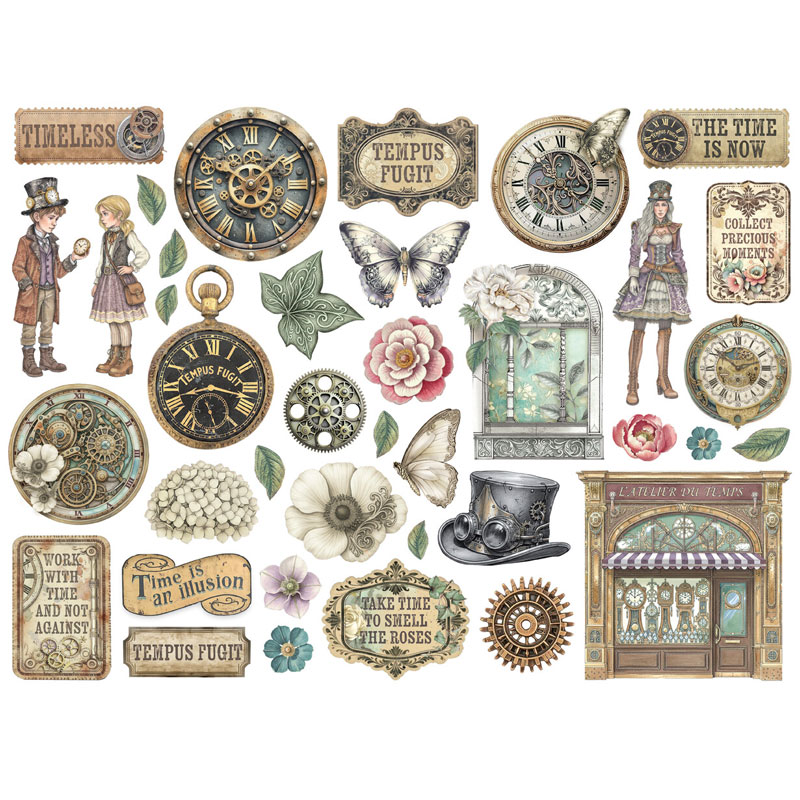 Färdigutskurna motiv och figurer i 2 mm kraftig kartong (chipboard) från Stamperias papperskollektion "Gardens of Time". Fina färgtryck och detaljer av hög kvalitet som kan pryda handgjorda kort och alster. Limmas enkelt fast på baksidan.