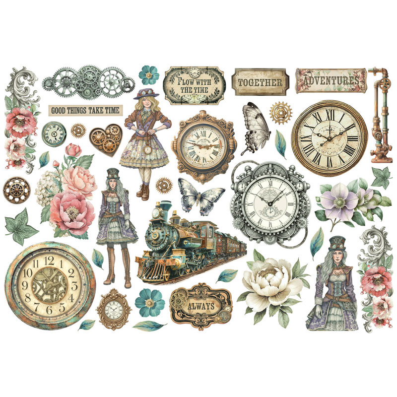 Självhäftande, färdigutstansade die cuts-figurer från Stamperia's steampunk-kollektion "Gardens of Time". Kraftig 300 grams kartong med kvalitativa färgtryck. I vissa vinklar skimrar figurerna lätt i pärlemoguld.