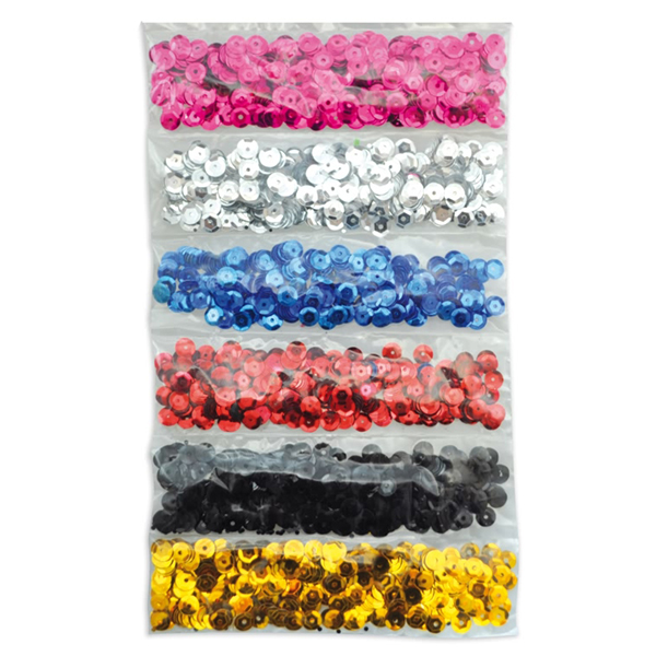 Runda paljetter i sex olika glänsande metalliska färger.
