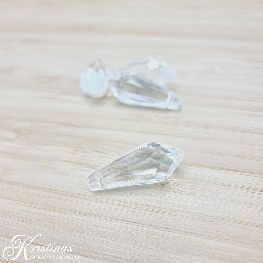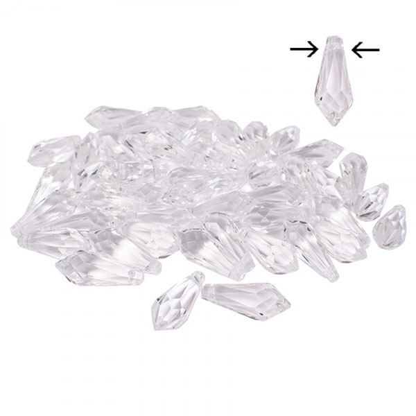 Vackra droppformade prismor i klar akryl med hål för upphängning. För all sorts smyckestillverkning och hemma-pyssel. Pilarna visar hål för upphängning.