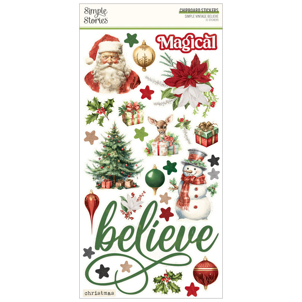 Stort ark med chipboard-stickers med klassiska julmotiv från serien "Simple Vintage Believe". Totalt 31 stickers med fina färger och självhäftande baksida.