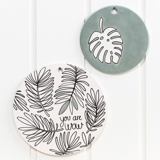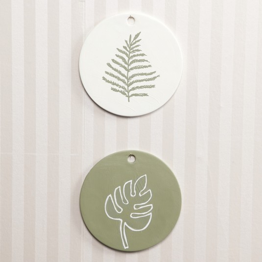 Rund keramikplatta med ett stort, runt hål till montering av snöre. Framsidan är glaserad.