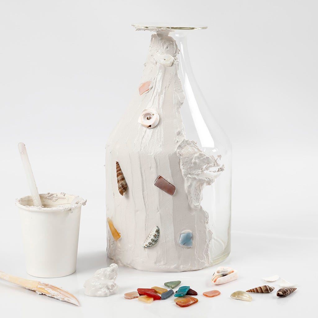 5. Vill du ha enbart vit gipsfärg, blanda gips och vatten, så konsistensen är som majonäs. Du ska använda 1 kopp gips till ½ kopp vatten. Blanda inte för mycket åt gången, det torkar nämligen mycket snabbt. Lägg på gipset med en modelleringspinne och gör olika mönster och prickar på ytan med modelleringspinnen. Sätt på mosaik och snäckor under arbetets gång, innan gipset härdar. Släta ev. ut gipset med lite vatten på ett finger.