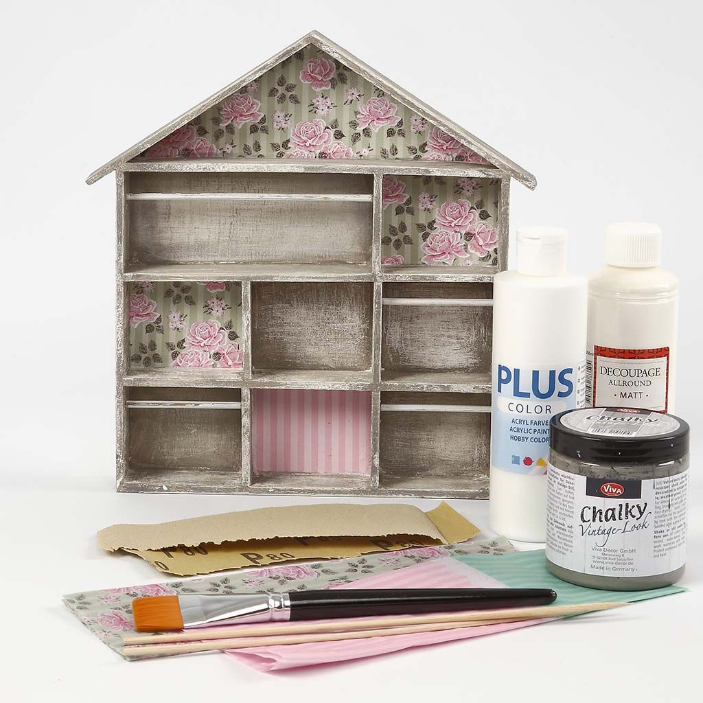 Prylhyllan grundas vit och målas med Chalky Vintage Look färg. Därefter monteras decoupagepapper och tvärgående pinnar i valda fack.