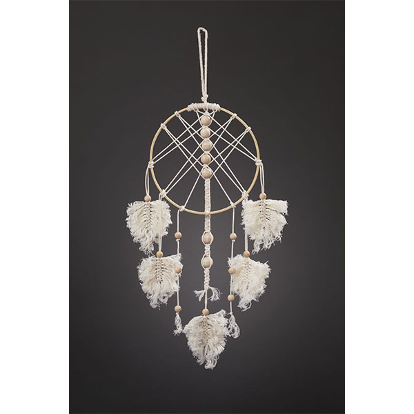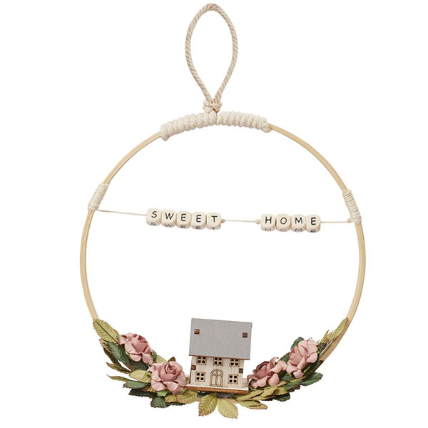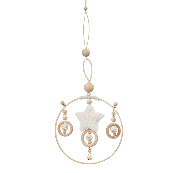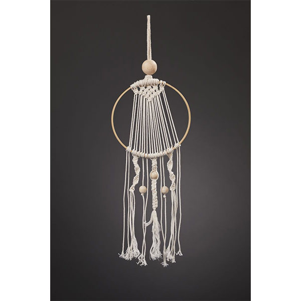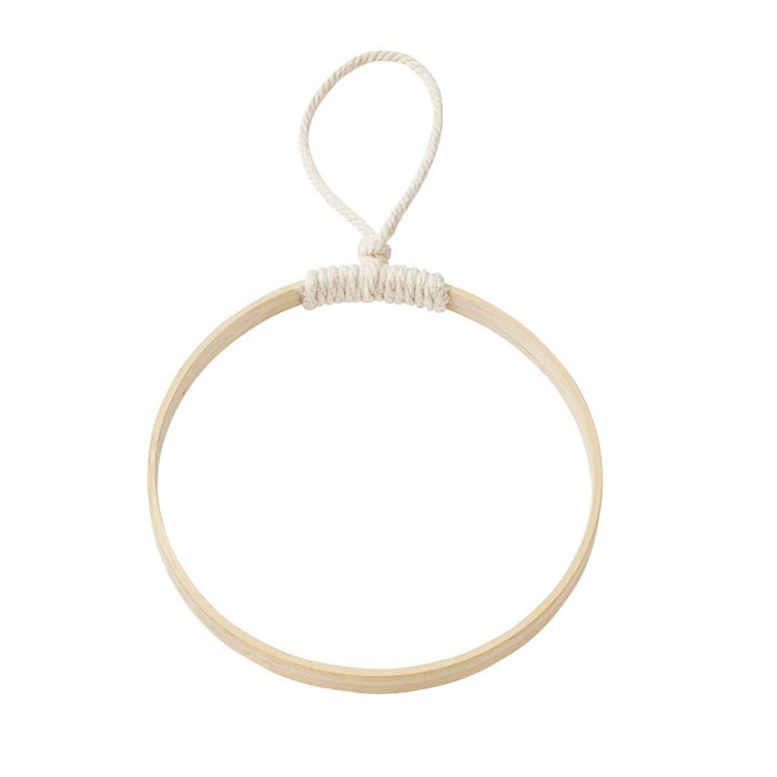 Dekorativ ring av olackat trä med bomullsnöre för upphängning. Färdig stomme för bl.a mobiler, kransar och drömfångare.