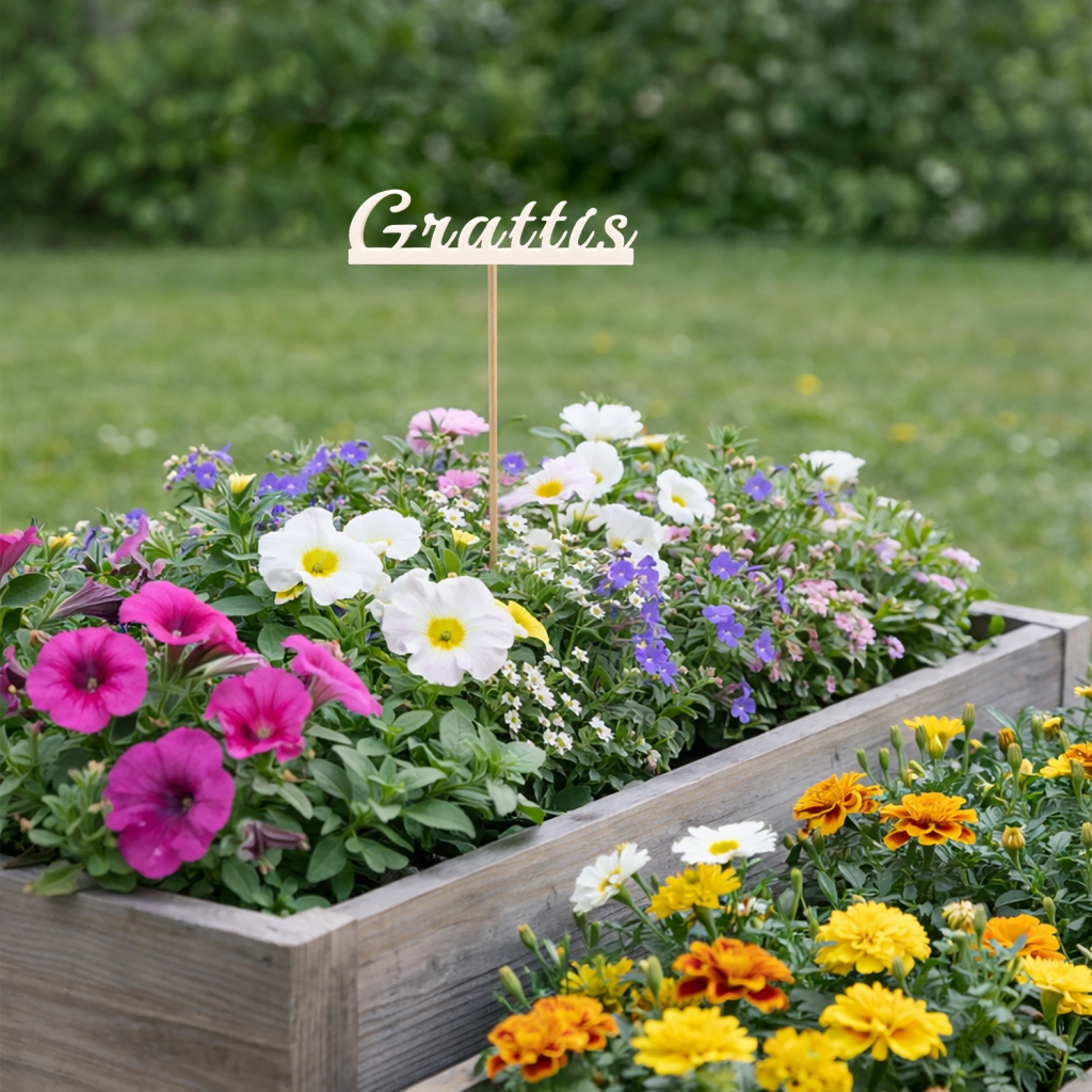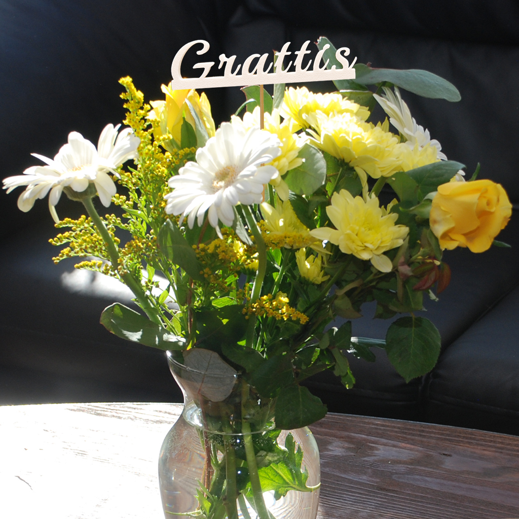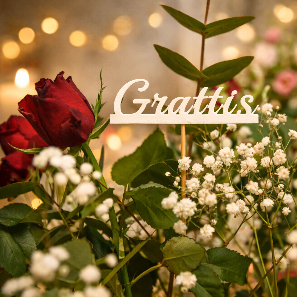 Grattis-skylt på pinne, 3D-printad i Sverige av PLA, biobaserad plast. Den unika designen gör att skylten kan användas på tre olika sätt: helt utan pinne som fristående dekoration, med pinnen underifrån för arrangemang där skylten ska stå stadigt, och med pinnen bakom text för kransar och dekorationer där du vill att pinnen inte ska synas framifrån.