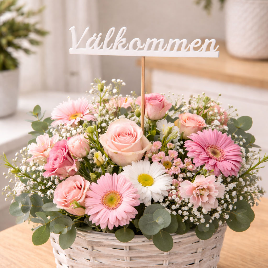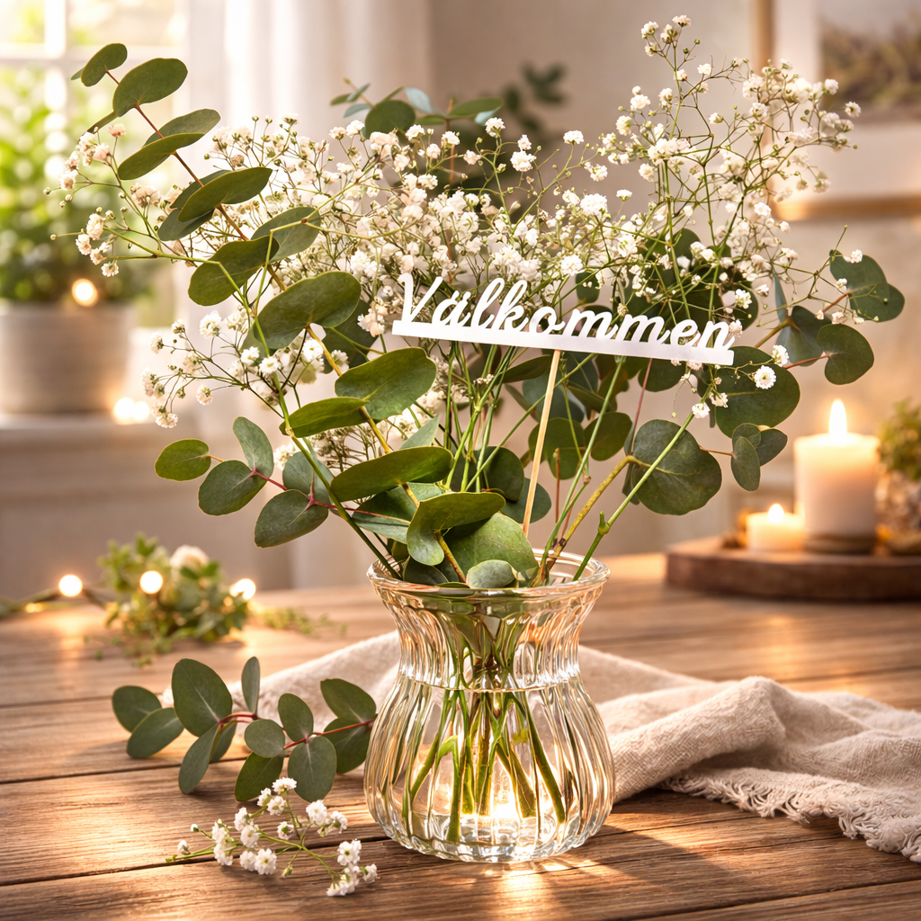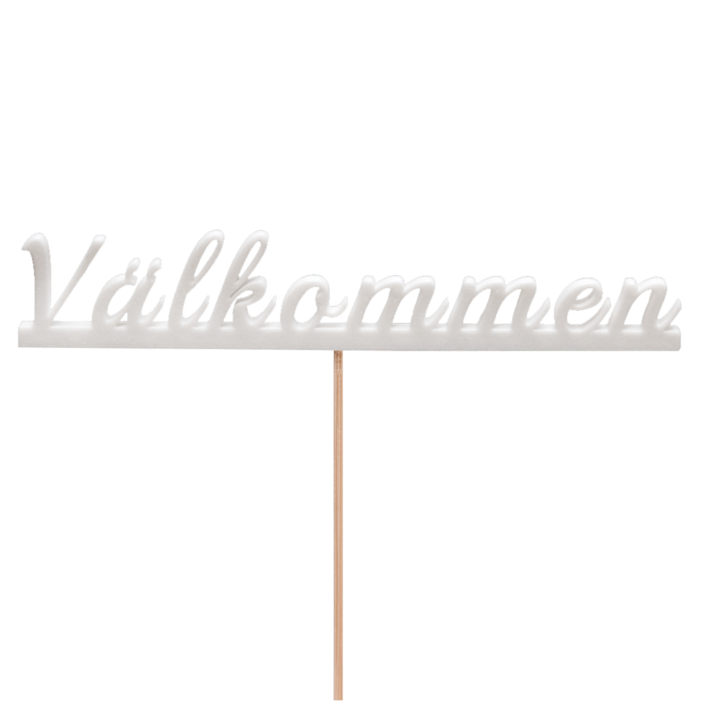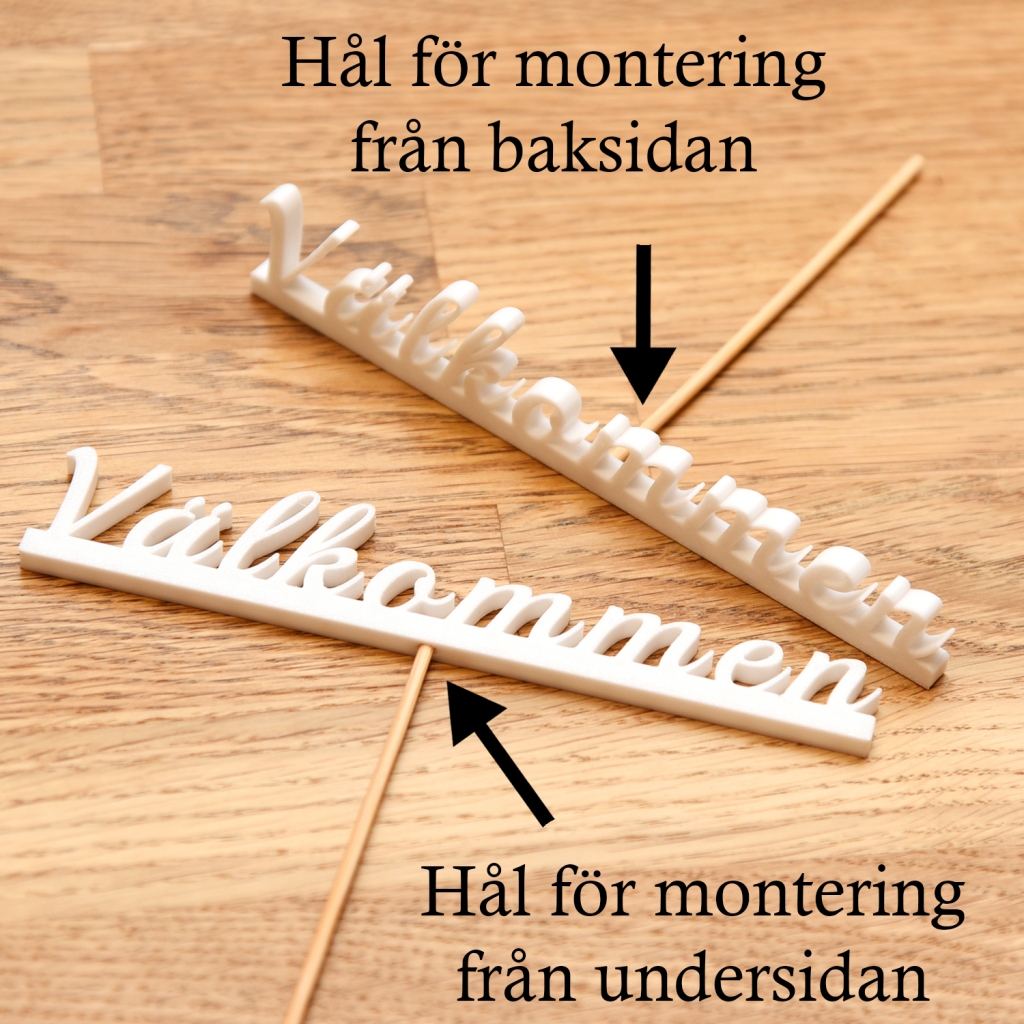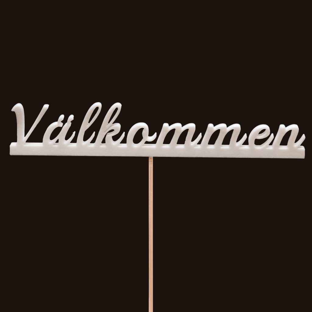 Välkommen skylt på pinne, 3D-printad i Sverige av PLA, biobaserad plast. Den unika designen gör att skylten kan användas på tre olika sätt: helt utan pinne som fristående dekoration, med pinnen underifrån för arrangemang där skylten ska stå stadigt, och med pinnen bakom text för kransar och dekorationer där du vill att pinnen inte ska synas framifrån.