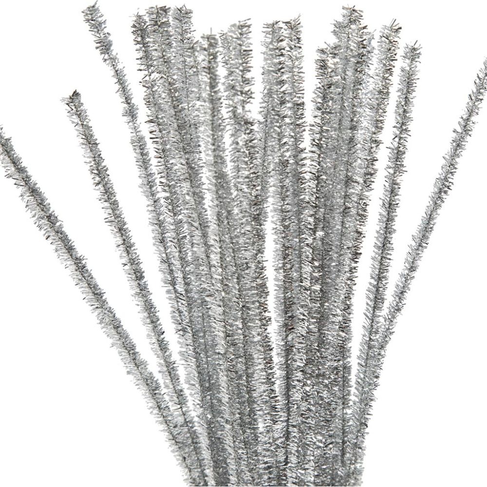 Glittrande, silverfärgade piprensare med tjocka nylonborst som är lätta att forma och tvinna. Använd dem till figurer, dekorationer och kreativa hobbyprojekt. De kan tryckas ner i frigolit och Silk Clay utan lim, formas till spiraler runt en penna och kombineras med pärlor för extra effekt. Passar pyssel hemma, i skolan och på fritids.