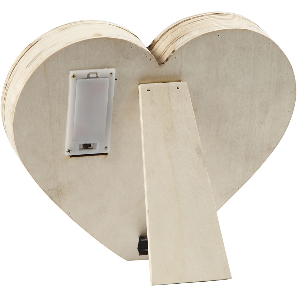 Hjärta av ljust trä med inbyggt ljus som lyser med 12 små lampor på framsidan. Är monterad med stödben på baksidan.