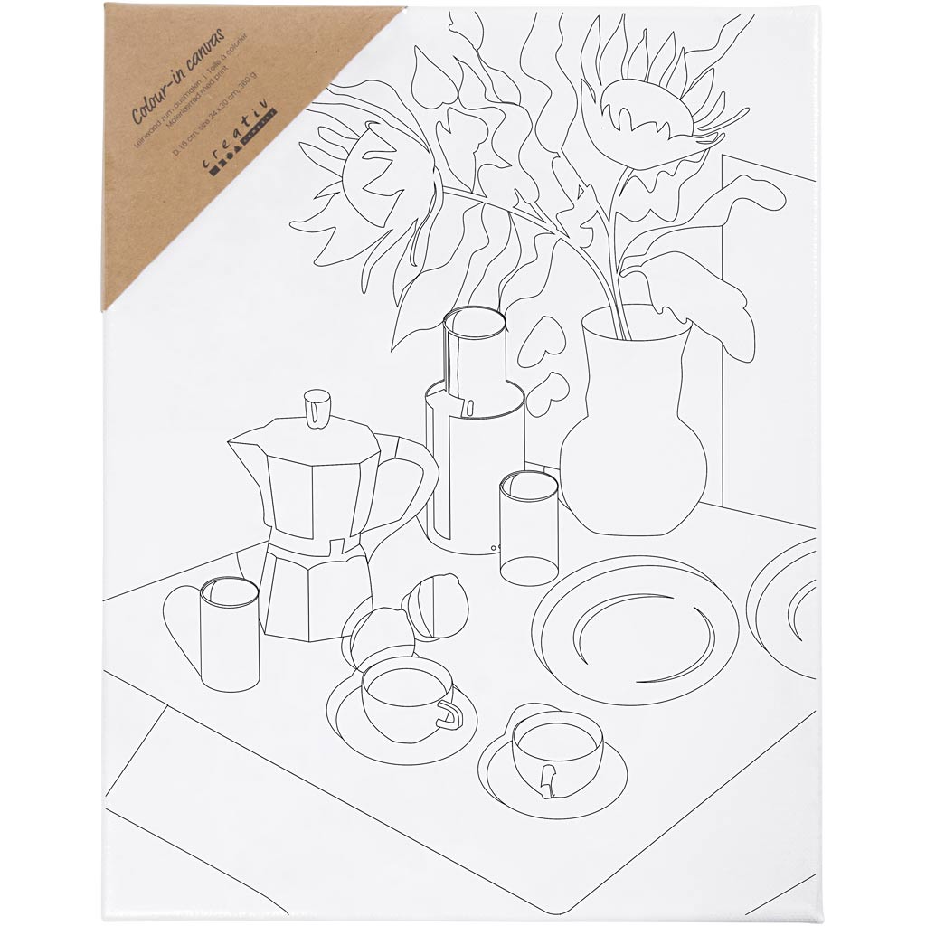 Förtryckt målarduk med motiv av ett frukostbord som är redo för din kreativitet. Måla, färglägg och dekorera med akrylfärg, tuschpennor eller färgpennor för att väcka motivet till liv. Duken är vitgrundad och uppspänd på spännram med sömlös kant för en ren, upphängningsklar finish. Ej lämplig för akvarellfärger. Små misstag kan täckas med svart tusch eller en akrylpenna med fin spets.