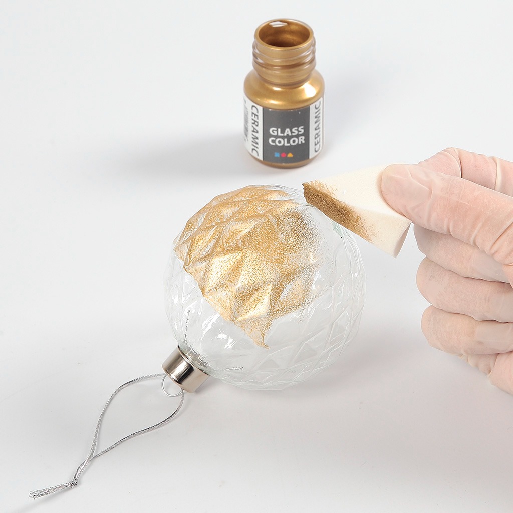 Vattenbaserad glasfärg med metallisk effekt för målning på glas och porslin. Färgen appliceras med pensel eller skumgummipensel. Placera det målade föremålet i kall ugn som värms upp till 160 °C. Härda föremålet i 30 minuter. Låt svalna i ugnen innan du tar ut det.
