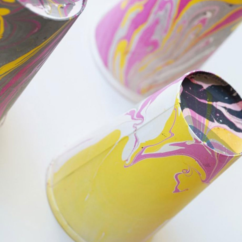 4. Dra försiktigt över vattenytan med en pinne, så färgerna marmorerar sig.