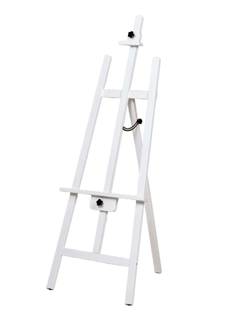 Detta vitlackerade staffli kombinerar klassisk form med stabil funktion. Trots sin nätta storlek står det stadigt under målning. Den stilrena designen ger en enkel och ren arbetsyta som passar perfekt i mindre rum, ateljéer eller för tillfälliga uppställningar.