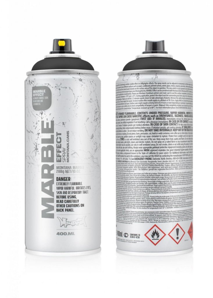 Montana Effect sprayfärg är en NC-Akrylbaserad sprayfärg. Färgen fäster på de flesta ytor utan att blekas eller krackeleras, även flexibla. Montana är känd för sin höga kvalitet och används av proffs och hobbykonstnärer över hela världen. Med Montanas exklusivt framtagna "low pressure system" får du jämna och rena linjer. Montana Effect Marble ger en realistisk marmorerad effekt medans ytan under blir delvis synlig.
