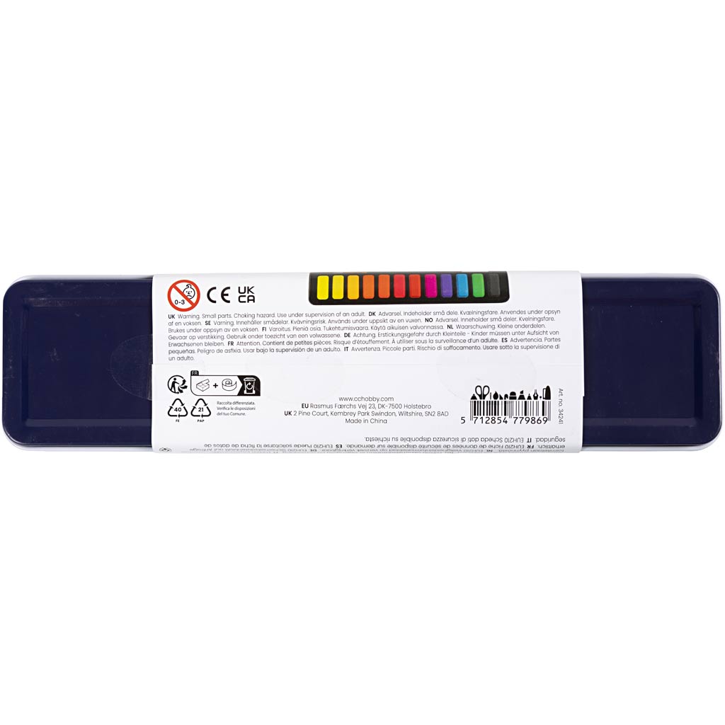 Högpigmenterat vattenfärgsset med 12 färger i en smidig metallåda som är enkel att ta med. Färgerna är lätta att arbeta med och blandas fint till nya nyanser och mjuka övergångar. Pensel ingår och locket fungerar som palett för färgblandning. För bästa resultat använd akvarellpapper. Tejpa gärna kanterna på arket innan du fuktar pappret, låt torka och skär längs tejpen för ett slätt resultat.