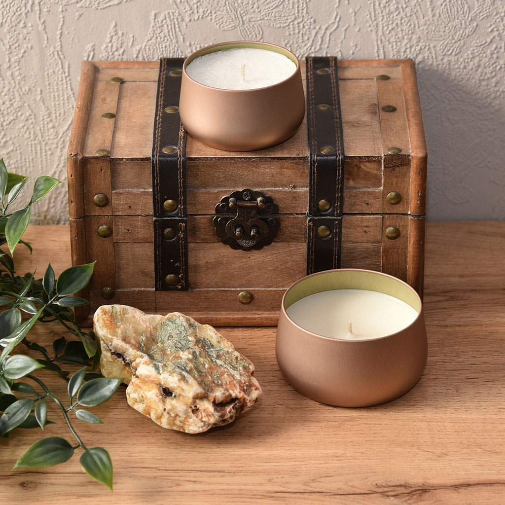 Elegant plåtburk med koppar-rosé-färgad yta utvändigt och invändigt guldfärgad. Matt utsida och ett blankt, förslutande lock. Med en stabil konstruktion och en rymlig kapacitet på 236 ml passar den utmärkt för ljustillverkning, förvaring av småsaker i hemmet, som gåvoask eller som en stilfull organisering av ditt pysselmaterial.