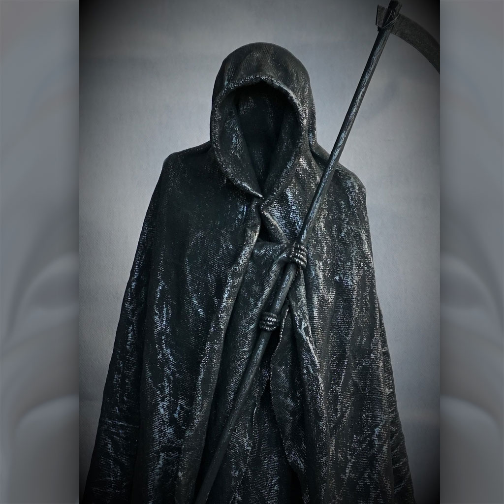 Stommen till den här liemannen är gjord av blompinnar, ihopsatta med ståltråd och en frigolitkula som huvud. Lien är gjord av kartong som också är limmad på blompinne.