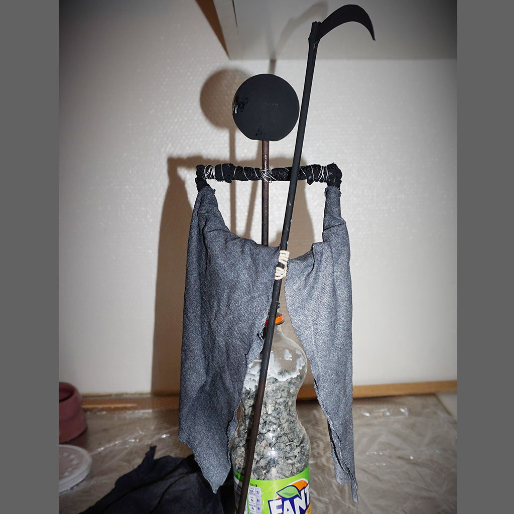 2. Vira en bit tråd runt fingrarna, mossgummi eller annat som kan se ut som händer. Dessa kommer att målas svarta sen. Placera din gubbe i en PET-flaska med lite sand eller grus i botten så att han står stabilt. Lien klipper du ut från en bit kartong och limmar fast på blompinne.