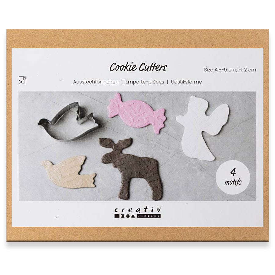 Set med utsticksformar i rostfritt stål som också fungerar som klassiska kakformar. Använd dem till kaksmet, sockerpasta och lera för att stansa ut motiv av ängel, ren, duva och karamell. Formarna ger rena konturer och är lätta att trycka ut, perfekt för bakning, pyssel och dekorationer.