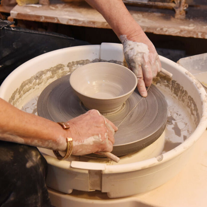 Skärtråd av metall med bekväma och gedigna handtag i trä. Gör det enkelt att skära upp större bitar lera, eller lossa ett lergods från drejskiva eller kavalett.