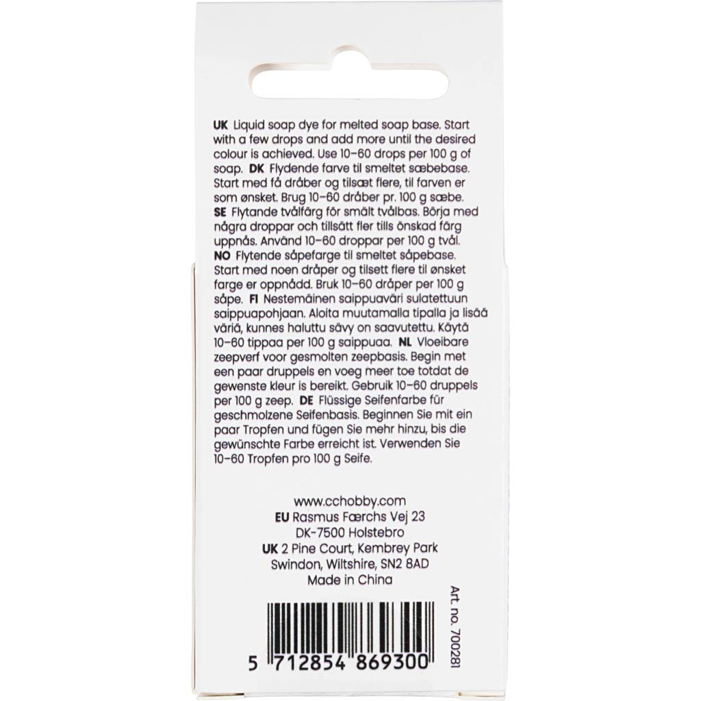 Flytande tvålfärg för tvåltillverkning av tvålbas och hemmagjorda tvålar. Färgen går att variera i flera nyanser baserat på mängden som tillsätts. Använd 10-60 droppar per 100 g tvål. Du kan även tillsätta doftolja för en härlig doft.
