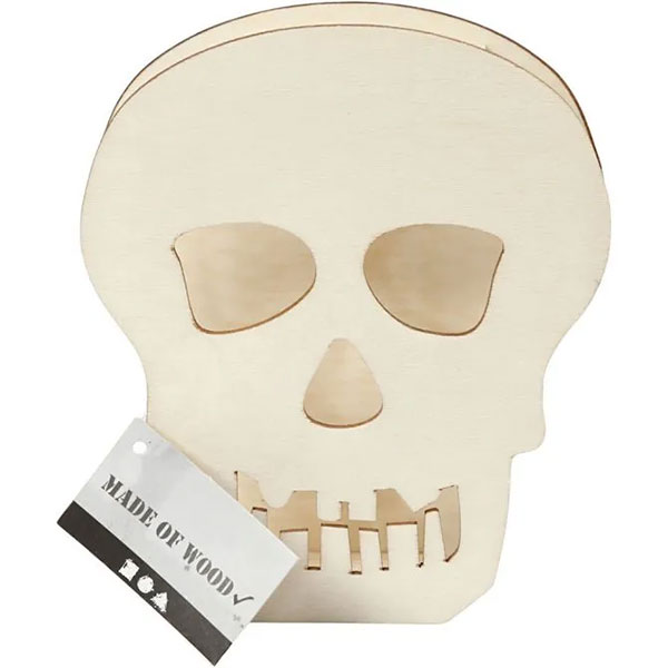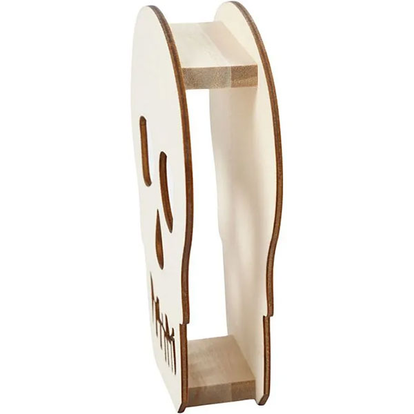Halloweenfigur i två lager ljust trä med utskärning och fot. Dekorera i de färger och med den teknik du önskar och placera ev. LED-ljus mellan de två trälagren, så figuren lyser upp och sprider en läskig stämning.