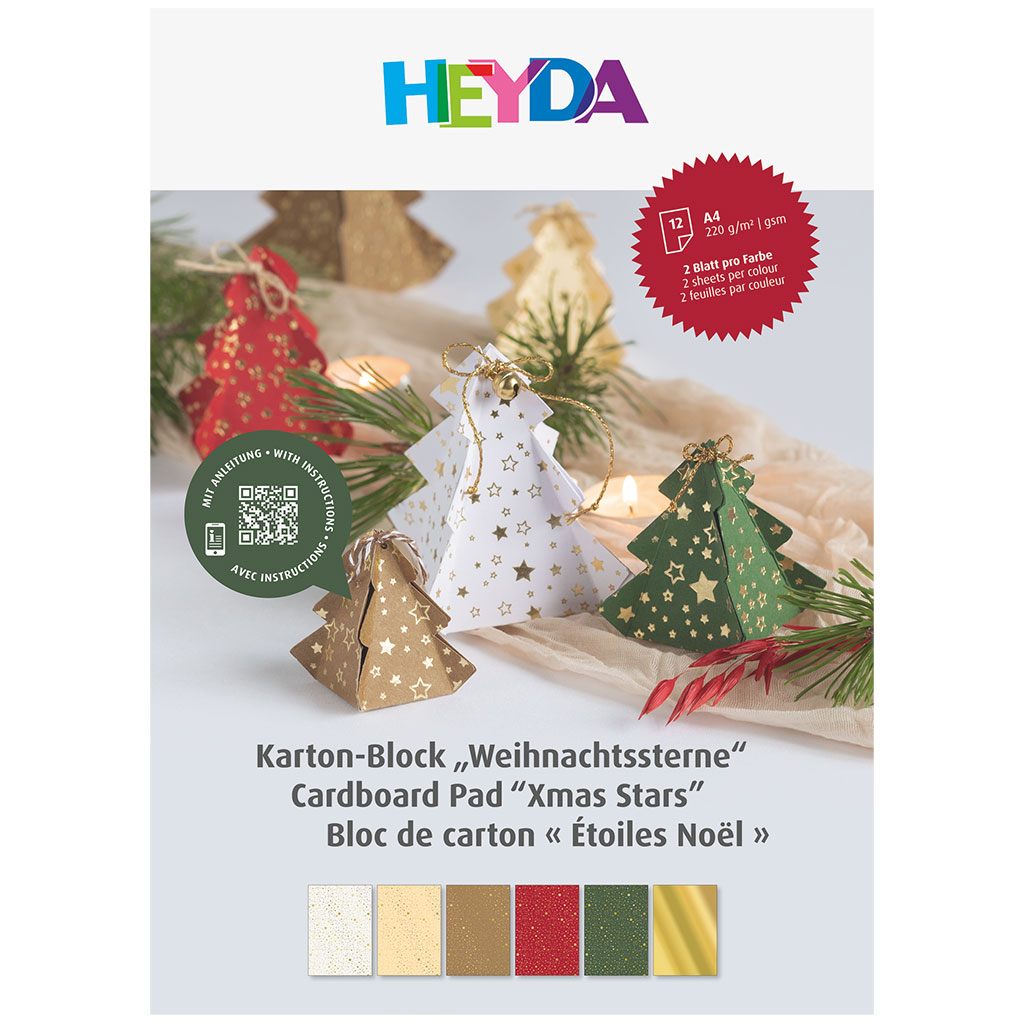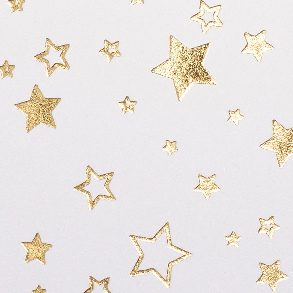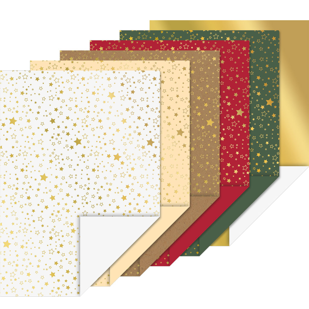 A4-kartong i kraftig 220 g kvalitet med vackra julpapper i stämningsfulla färger. Setet innehåller tio ark med mönster av guldfoilerade stjärnor samt två ark metallkartong i guld. Perfekt till julkort, paketdekorationer, etiketter och andra kreativa projekt. Baksidan är slät och enfärgad. Topplimmad kant gör arken enkla att riva loss.