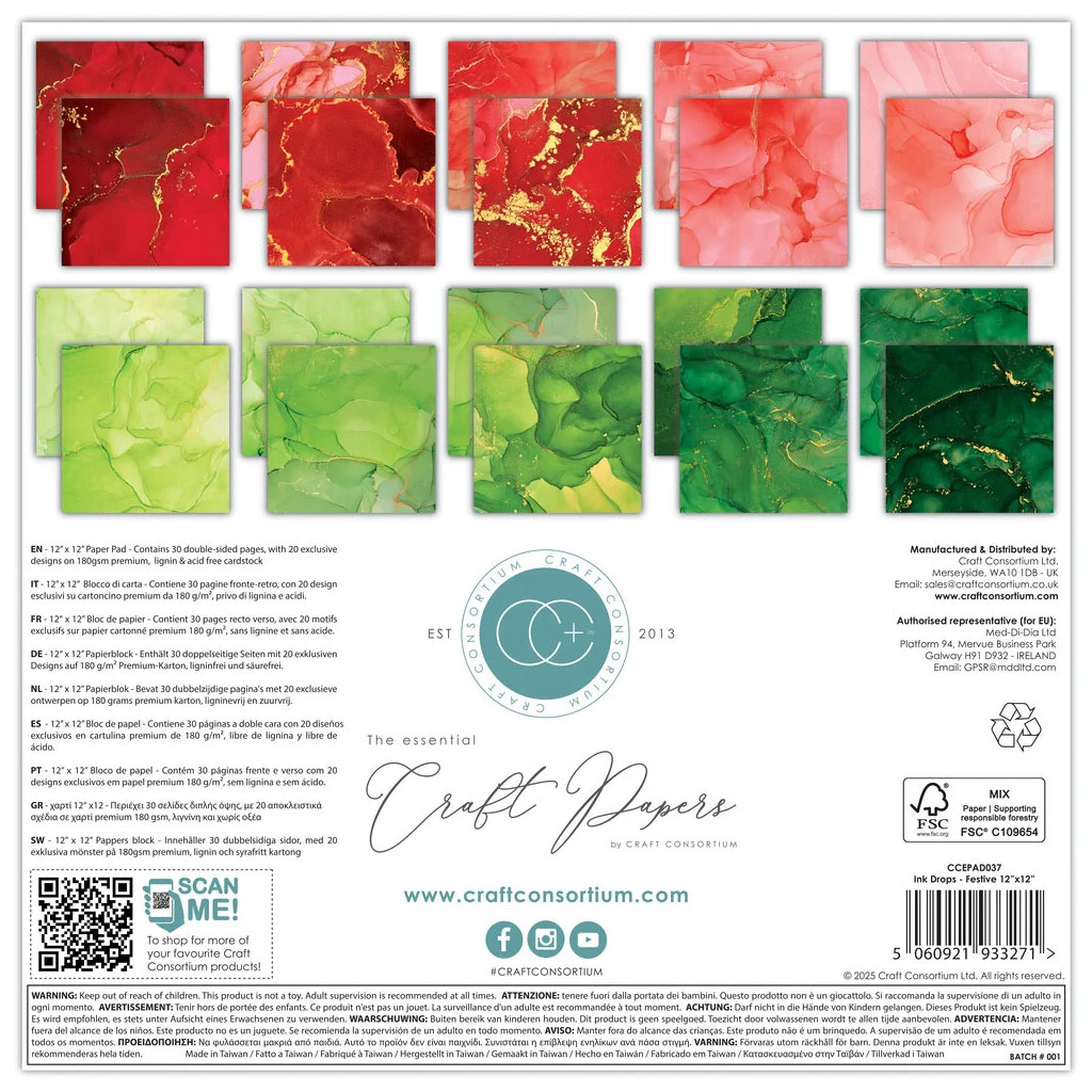 Elegant papperskollektion från Craft Consortiums, inspirerad av julens färger och glans. Ink Drops Festive bjuder på marmorliknande mönster i varma röda och gröna toner, med inslag av gyllene nyanser. Perfekt för jul- och vinterprojekt, kortmakeri, scrapbooking och presentinslagning.