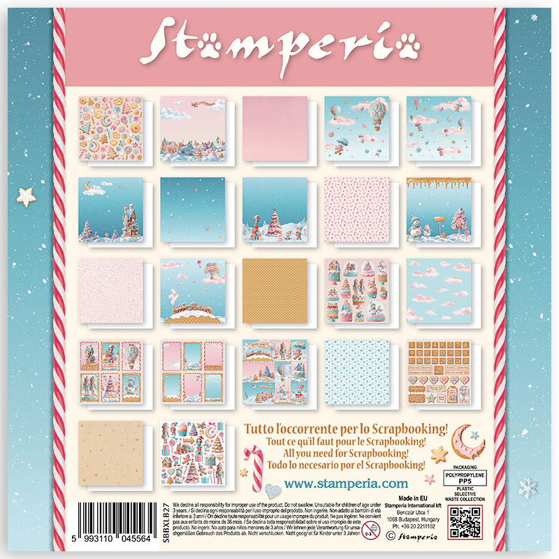 Scrapbookingpapper från Stamperia med julkollektionen Candy Christmas. Blocket innehåller hela 22 enkelsidiga ark med fina bakgrundsmotiv. Serien går i rosa och turkos med ett lekfullt tema av kakor, godis och julbak, fylld av fantasifulla motiv och detaljrika illustrationer.