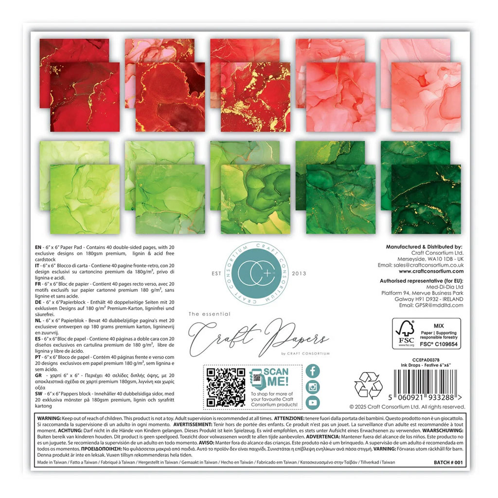 Elegant papperskollektion från Craft Consortiums, inspirerad av julens färger och glans. Ink Drops Festive bjuder på marmorliknande mönster i varma röda och gröna toner, med inslag av gyllene nyanser. Perfekt för jul- och vinterprojekt, kortmakeri, scrapbooking och presentinslagning.
