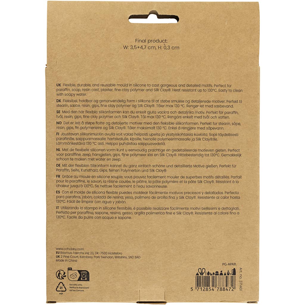 Gjutform i mjuk plast och motiv med granar och snöflingor med upphängningsögla. Formen kan användas för gjutning av betong, lera, resin, ljusmassa, gips och tvål. Värmebeständig upp till 130°C.