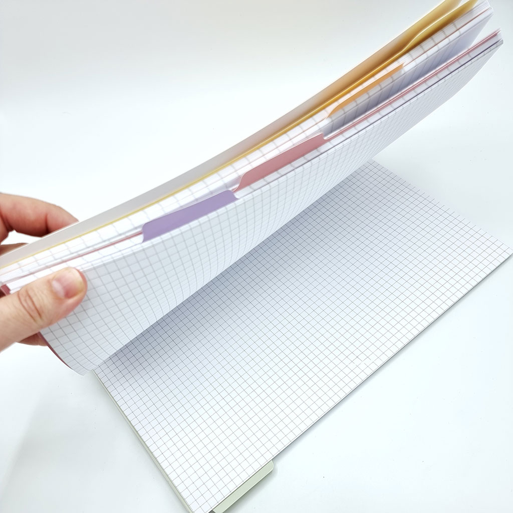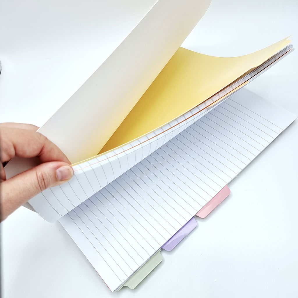 De fem färgade flikarna gör det enkelt att dela upp blocket efter olika ämnen eller projekt. Spiralryggen i metallisk guldfärg håller sidorna på plats och gör att blocket ligger plant när du skriver. Innehåller 90 linjerade ark och 60 rutade ark. Praktiskt för både anteckningar och beräkningar.