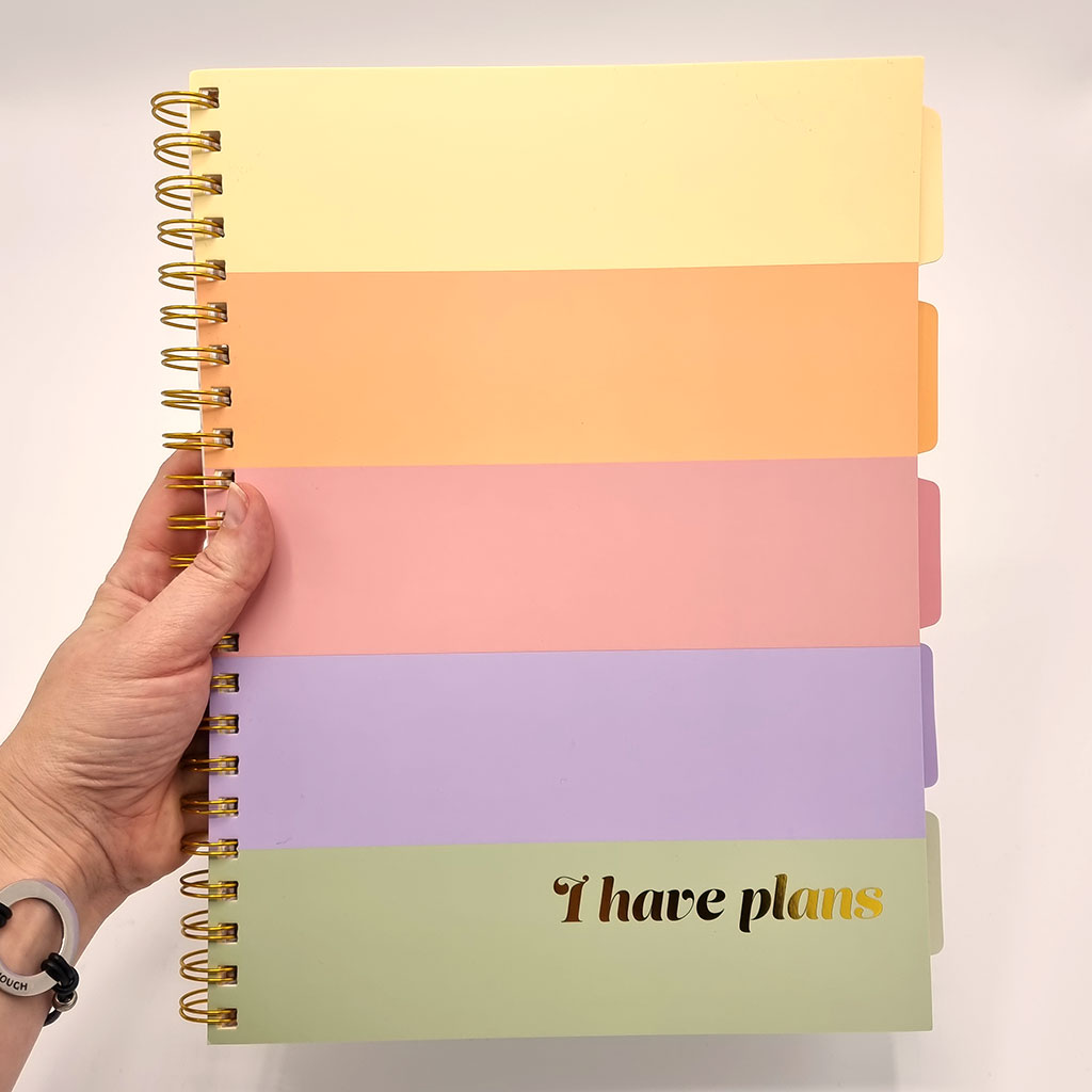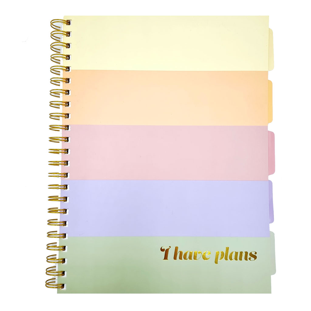5-ämnesblock i A4-format med hela 150 blad. Perfekt för skola, studier eller arbete. Blocket är FSC-märkt och tillverkat med 70 grams papper av hög kvalitet. Framsidan pryds av texten "I have plans" i elegant guldfolie, vilket gör blocket både funktionellt och stilfullt.