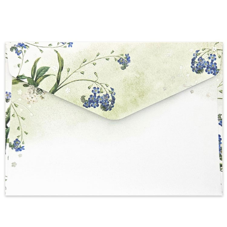 Kuvert med motiv av blå förgätmigej, prydda med metalliska foliedetaljer. Perfekta för inbjudningar, presentkort eller brev.