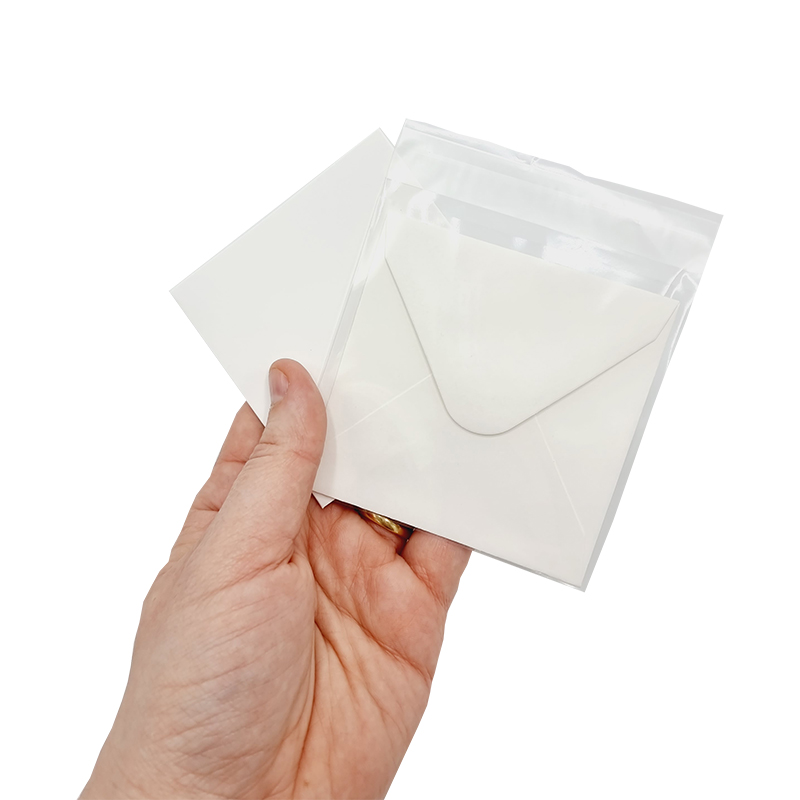 Små kort och kuvert till inbjudningar, save the date, blomsterkort, grattiskort eller presentkort. Korten är släta och tillverkade av kraftig 300 g kartong i vitt. Matcha med cellofanpåsar 3"x3", CUK1022.
