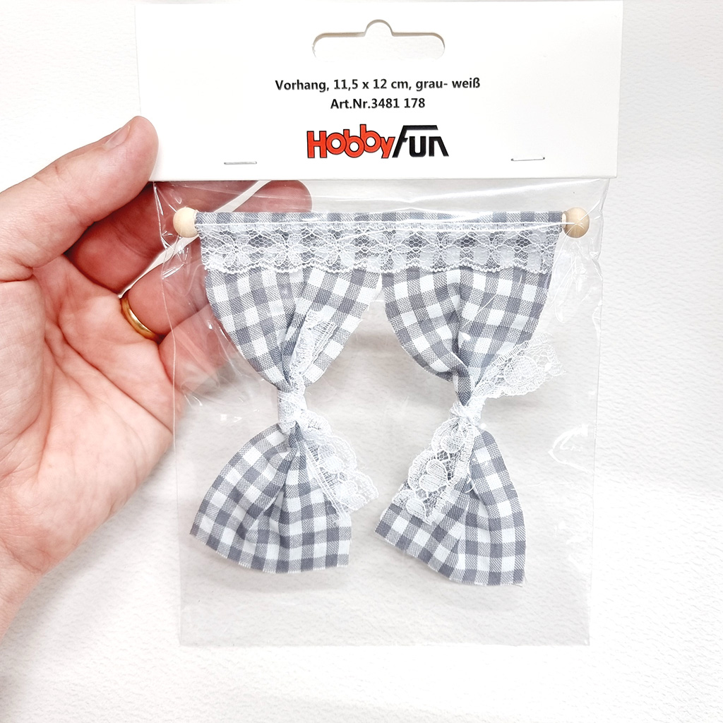 Verklighetstrogna miniatyr gardiner med grårutigt tyg. Gardinerna hänger på en gardinstång av trä med träknoppar. Gardinerna har en fåll överst av ett skirt spetsband med blommig design. Spetsbanden som samlar ihop gardinerna har en design med gulliga hjärtan.