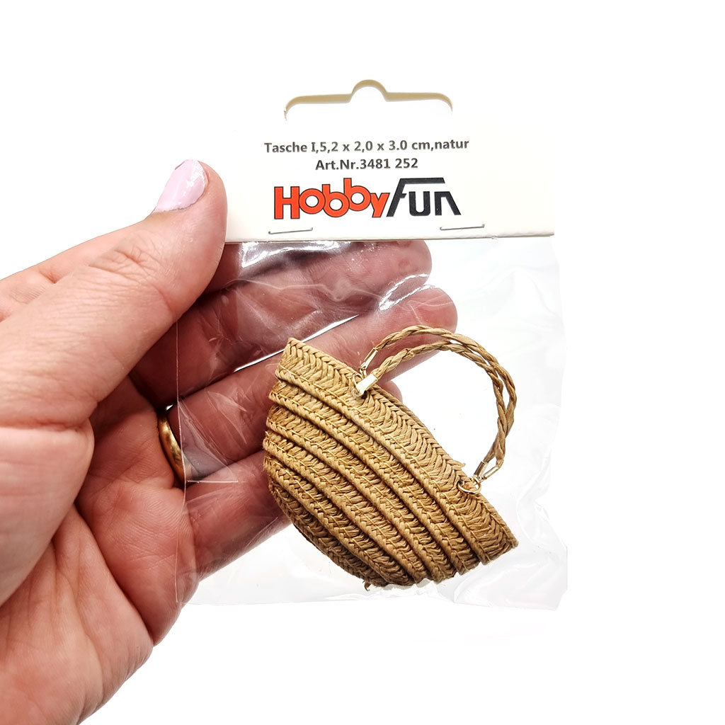 Flätad strandväska i miniformat för dig som älskar små miniatyrföremål. Perfekt till miniatyrvärld, fairy garden, nissebus, nissehus eller dockhus.