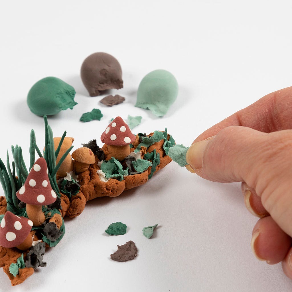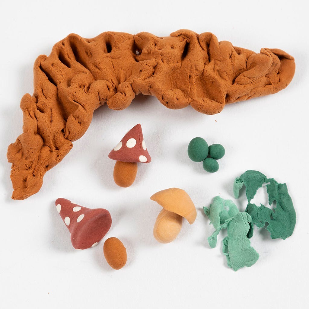 Innehåll: Röd och vit hobbyfilt, Silk Clay-lera i naturfärger, bomullssnöre, rundstavar och en mall.