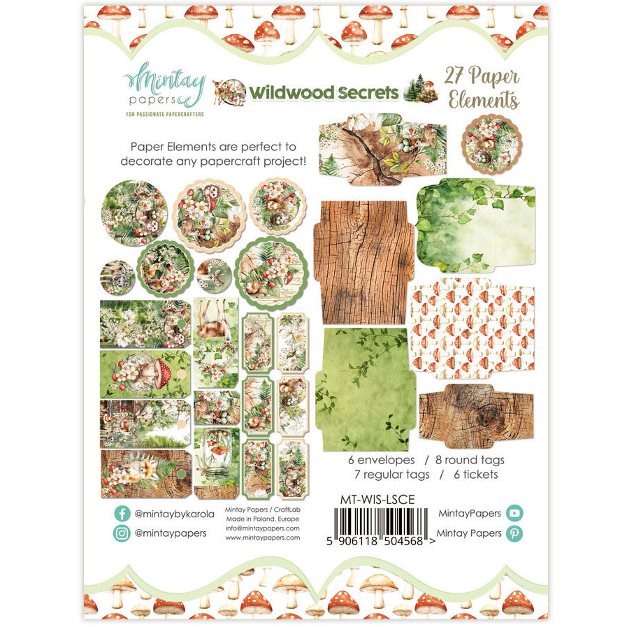 Färdigutskurna figurer i kraftigt papper från Mintays skogsinspirerade kollektion "Wildwood Secrets". Innehåller 27 delar med etiketter, tags, små kuvert och runda, utstansade skogsmotiv. Matcha med mönstrade papper från samma kollektion.