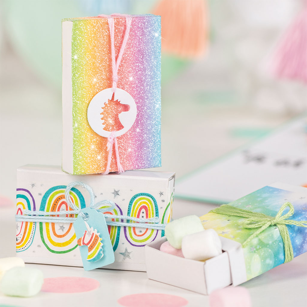 Dekorationstejp med glittereffekt i regnbågens färger från tyska märket Heyda. Perfekt för kreativt pyssel, paketinslagning, kortmakeri och andra projekt. Två rullar, levereras i en praktisk förpackning med rivkant.