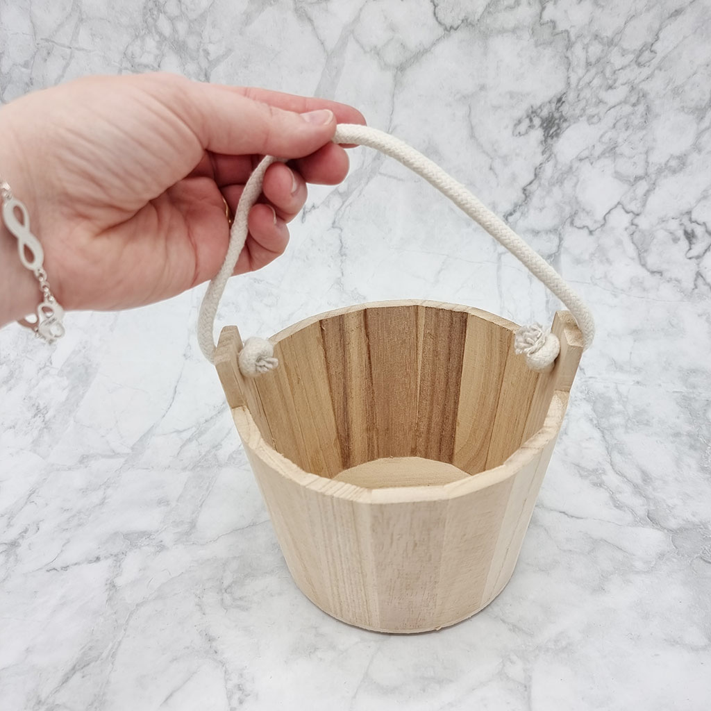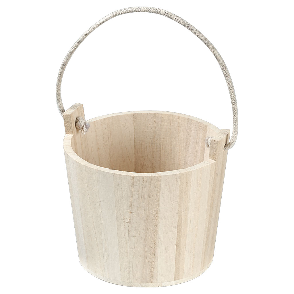 Rund och kraftig hink i obehandlat trä, tillverkad av furu med 7 mm tjocka väggar. Försedd med ett stadigt vitt bomullssnöre som handtag. Hinken är perfekt för kreativa projekt och kan enkelt dekoreras med akrylfärg, stämplar, schabloner, decoupage eller andra tekniker. Fyll den med oasis och använd som en personlig blomkruka, eller låt den bli en dekorativ inredningsdetalj.