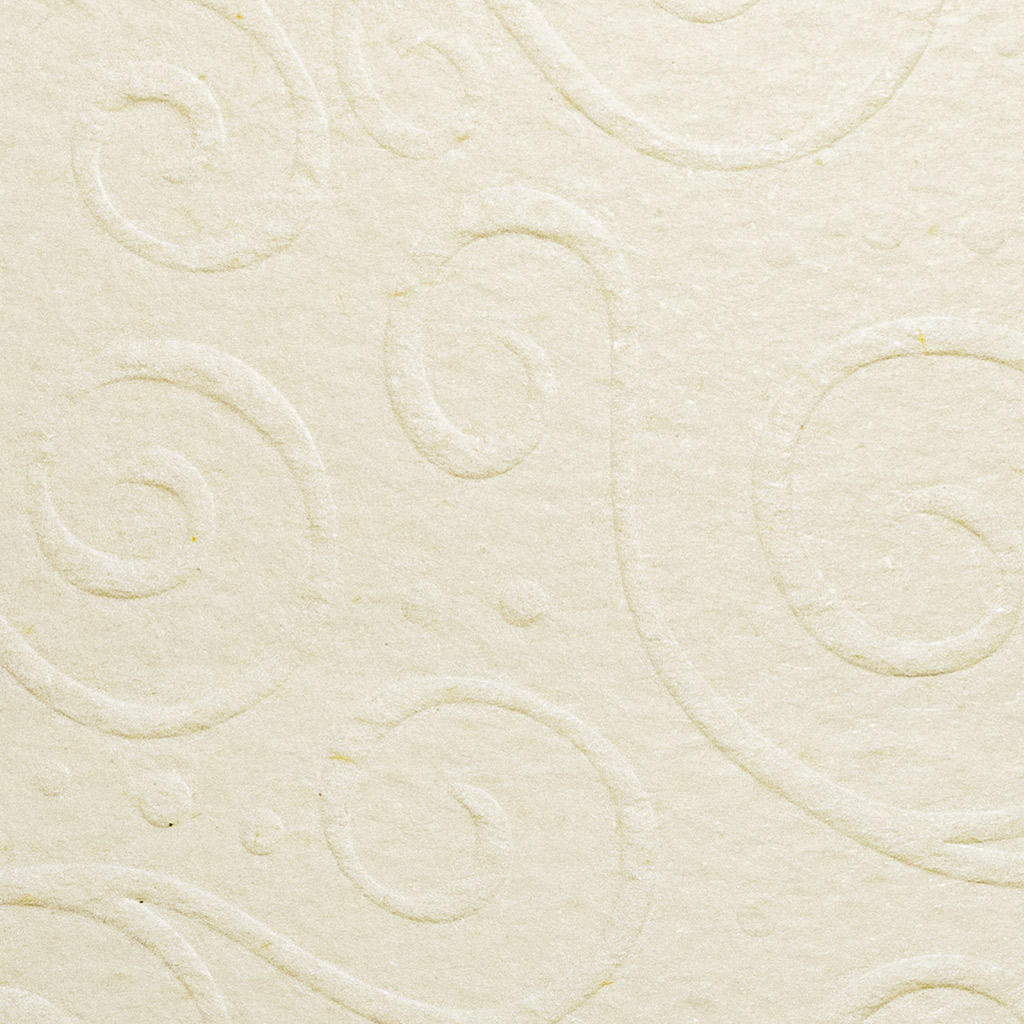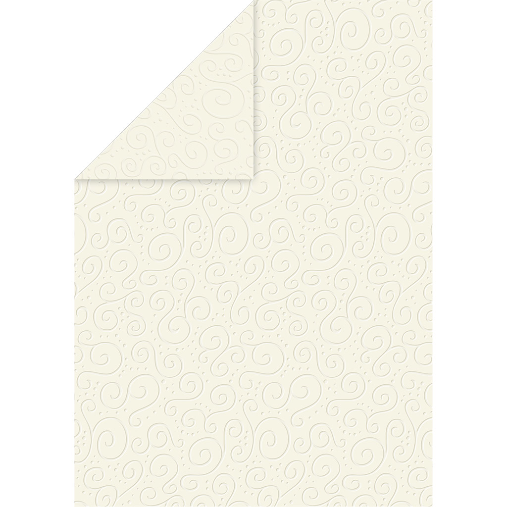 Mycket elegant papper i ljust cremefärgad nyans med embossad / präglad yta och upphöjt swirl-mönster. Kraftig kartong till kortbas eller omslag på t.ex. inbjudningar, festprogram, bröllop m.m.